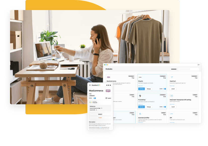 Make invoicing and accounting for your eCommerce business a breeze with Invoice123. Our platform integrates seamlessly with Shopify, Woocommerce, and API to streamline the invoicing process.